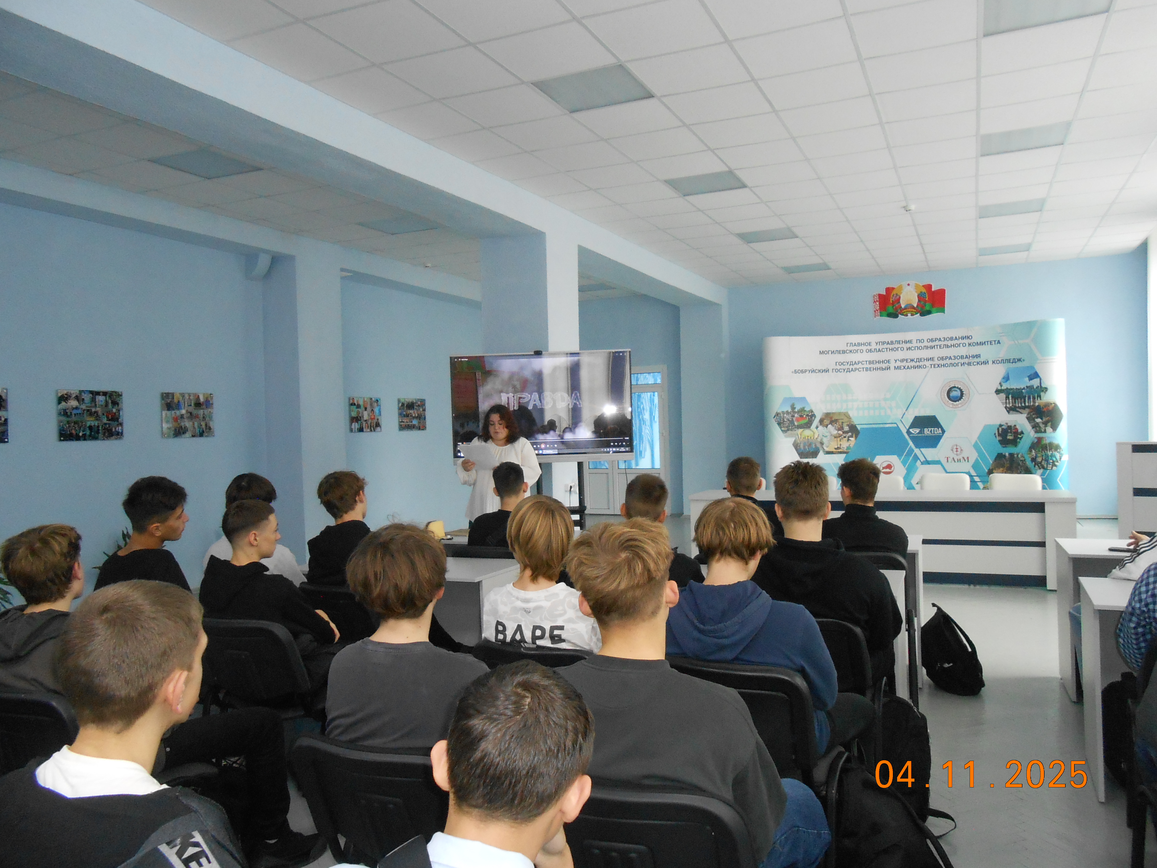 4 ноября 2025 года специалистами учреждения здравоохранения «Бобруйская городская детская больница» в ГУО «Бобруйский государственный механико-технологический колледж» проведена акция «Зависимость. Разрушая иллюзии». Цель мероприятия: повышение осведомленности по вопросам негативного влияния потребления никотинсодержащих и табачных изделий на здоровье, прежде всего, в контексте развития онкологических заболеваний, формирования у подростков негативного отношения к потреблению табака и иной никотинсодержащей продукции, мотивации на ведение здорового образа жизни. В рамках мероприятия ребятам демонстрировался видеофильм «Правда о табаке» с последующим обсуждением, проведена беседа-диалог о пагубном влиянии электронных сигарет. Заключительным аккордом стал флеш-моб #ЖИВИ_АКТИВНО_БЕЗ_НИКОТИНА. Все желающие ребята присоединились к мероприятию и выразили свое негативное отношение к курению.